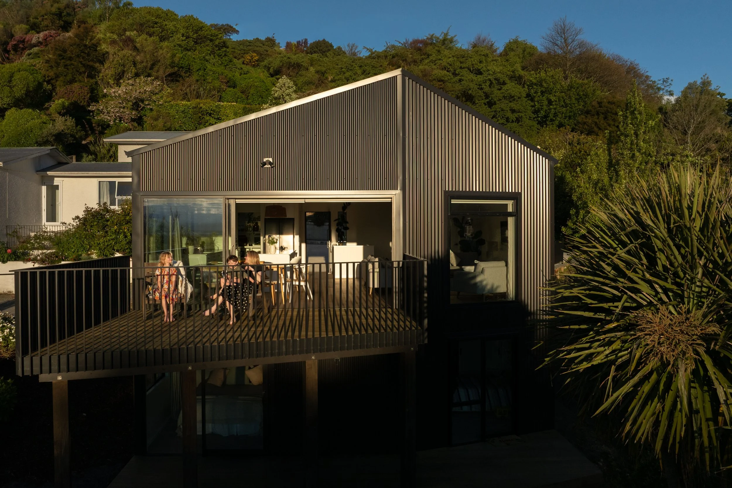 Dark vertical cladding and elevated living spaces create a confident form that responds to both the landscape and the challenges of the site.